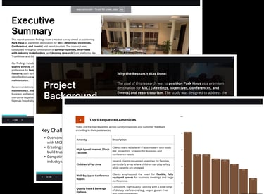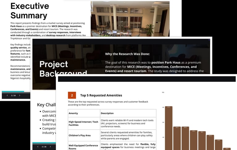 I conducted comprehensive market research and turned the findings into a professional presentation deck to help position a hospitality brand for growth. By summarizing complex survey data into clear charts and actionable recommendations, I provided the leadership team with a direct roadmap for improving their services and amenities.
