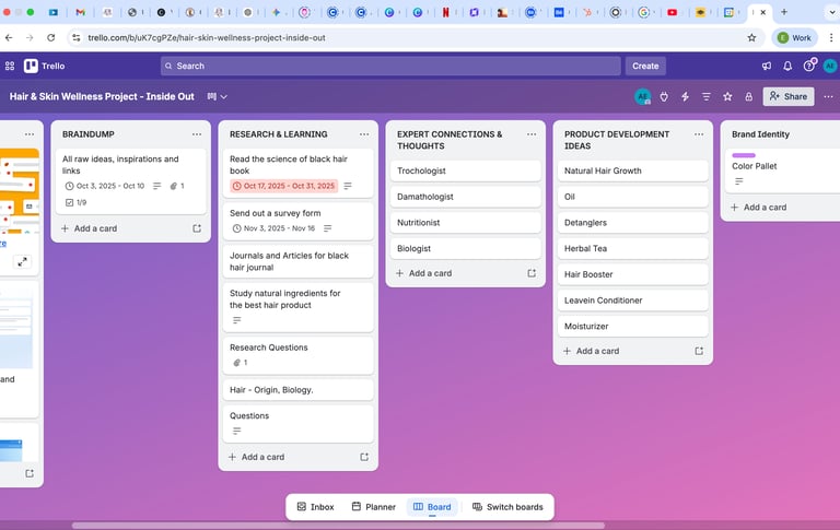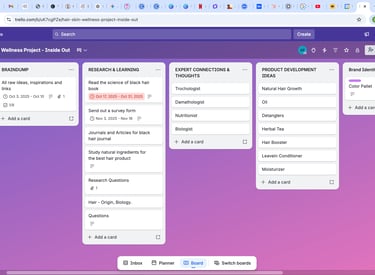 I am currently using a structured Trello system to manage every phase of my wellness project, from initial research to product development ideas. This allows me to track live milestones and organize complex information in real-time, ensuring the project moves forward with complete clarity and order.