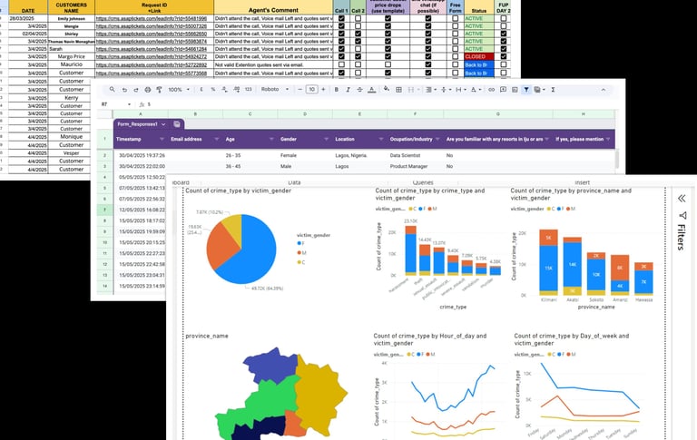 I built a system to track every step of our customer follow-ups and survey responses to make sure no lead was forgotten. I then turned those lists into simple charts so we could finally see our top locations and trends without scrolling through thousands of rows.